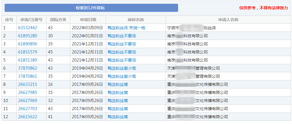 不过“鸭血粉丝”的相关商标已经有企业提前展开了布局。据查询,“鸭血粉丝”的相关商标信息共有12件,其中第43类、第35类上提交的商标申请所占比例最多,且已有不少商标已经成功注册,不知道这会不会成为“鸭血粉丝汤”申请的阻碍。