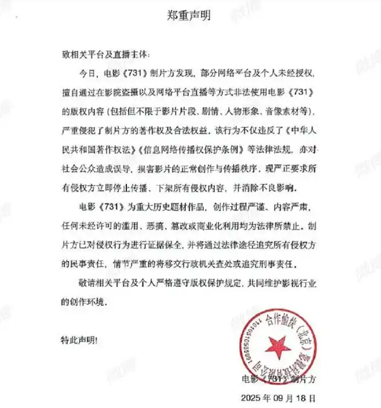 9月18日这个特殊的日子,电影《731》正式上映,却遭遇了令人痛心的盗摄和侵权乱象!当日下午,电影官方微博发布郑重声明,直指部分网络平台及个人通过影院盗摄、网络平台直播等方式非法使用影片内容,严重侵犯著作权。