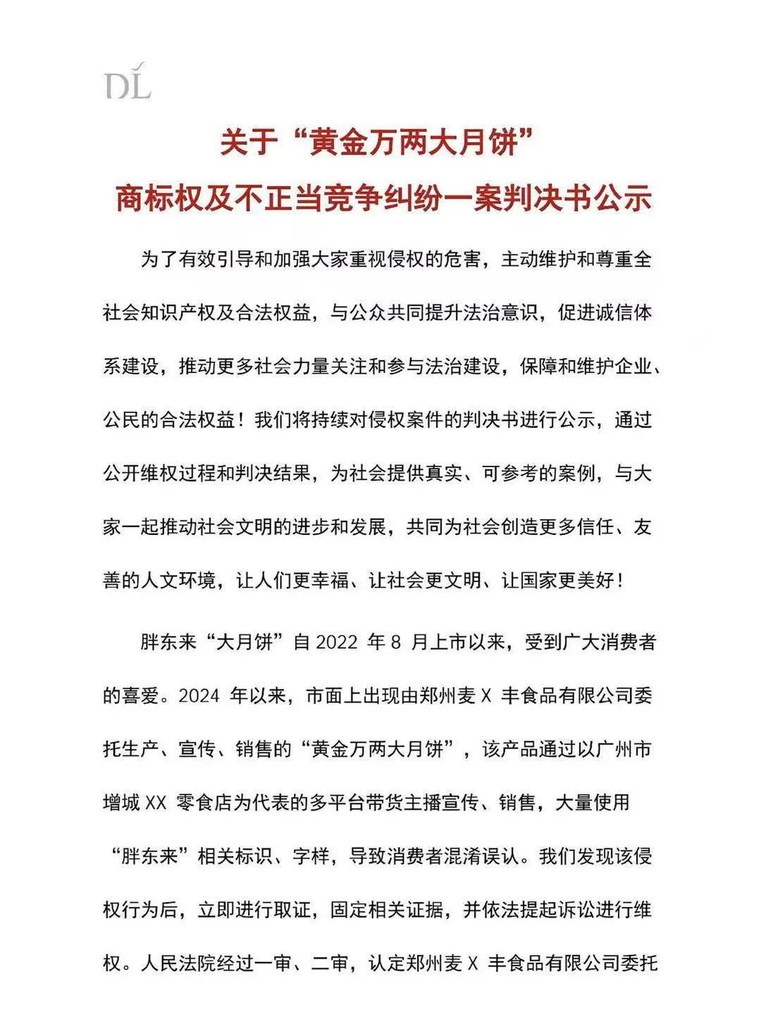 2月25日晚,胖东来官方账号发布关于“黄金万两大月饼”商标权及不正当竞争纠纷一案判决书公示。公示中提到,胖东来“大月饼”自2022年上市后广受喜爱,2024年以来,市面上出现由郑州某食品有限公司委托生产、宣传、销售的“黄金万两大月饼”,该产品通过以广州市增城XX零食店为代表的多平台带货主播宣传,销售,大量使用“胖东来”相关标识、字样,导致消费者混淆误认。胖东来发现该侵权行为后,立即进行取证,固定相关证据,并依法提起诉讼进行维权。法院审理后认为,一审法院综合考量麦X丰公司的经营规模、涉案产品销量、销售额、侵权持续时间、主观过错程度,以及胖东来商贸公司、胖东来实业公司为维权支出的律师费、公证费等合理开支,判决赔偿经济损失300万元及维权合理开支5万元,以及判决在宣传中使用“胖东来”字样构成商标侵权及不正当竞争的XX零食店赔偿经济损失2000元并无不当,予以维持。河南省高级人民法院综合案件情况,最终决定驳回上诉,维持原判。