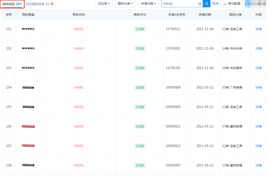 长城汽车作为1984年的成立的我国自主汽车品牌,发展30余年,对于核心技术的保护以及商标布局一直做得很好。经查询,长城汽车旗下共有12132件专利信息,5855件商标信息,其中对于哈弗品牌的保护更是令人称道,目前已有167件“HAVAL”相关商标已经成功注册。