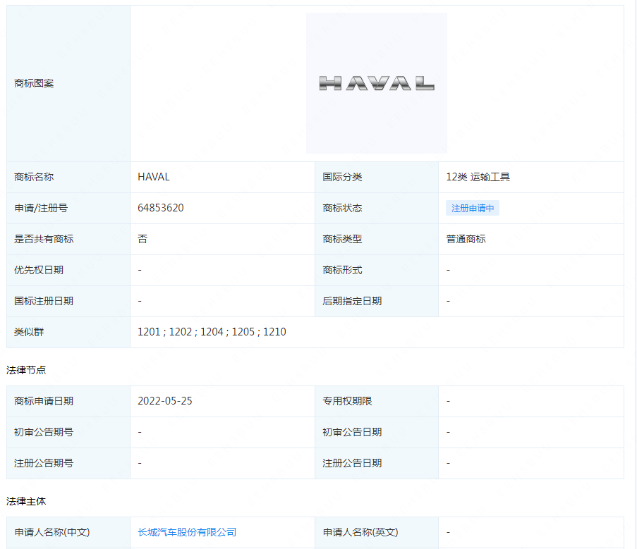 据查询,在今年的5月25日,长城汽车股份有限公司就向商标局递交了全新“HAVAL”的商标,国际分类为第12类-运输工具,目前商标正处于注册申请中,相信成功拿下也只是时间问题。