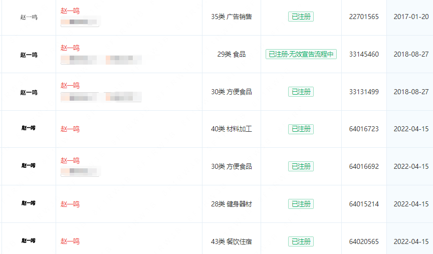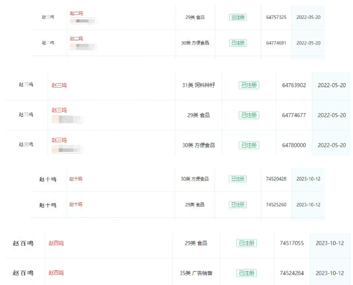 值得一提的是,赵一鸣在注册防御性商标上的布局展现出了其深邃且卓越的战略眼光,其名下申请布局了多枚“赵二鸣、赵三鸣,赵十鸣、赵百鸣、赵千鸣、赵万鸣、赵亿鸣”等商标。